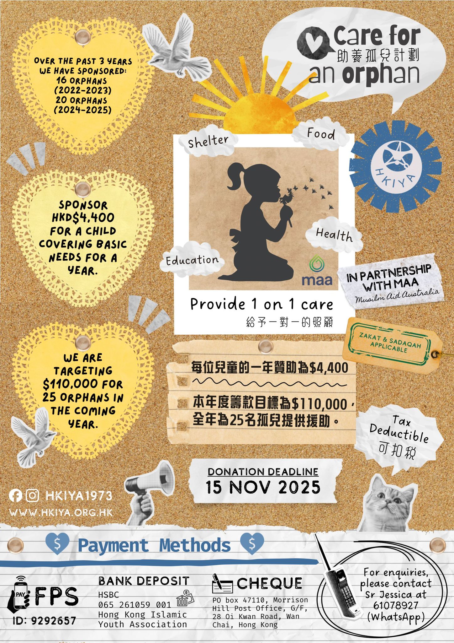 Goal: HKD 110,000 (HKD 4,400 per orphan) to provide 1‑on‑1 care—shelter, food, health, education